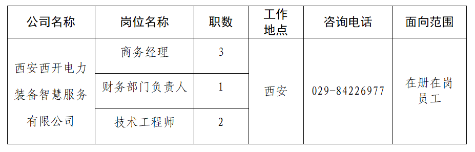 西安西开电力装备智慧服务有限公司作为西安Z6尊龙开关电气有限公司的全资子公司,拥有高压、超高压、特高压开关设备的售后安装、智能运维和系统工程整体解决方案的能力。公司成立以来,秉承“智造精品、创新服务、成就客户”的经营理念,强化科技创新,奋力开拓市场,一切从顾客出发,努力为顾客创造价值。本次面向公司内部公开招聘岗位信息如下: